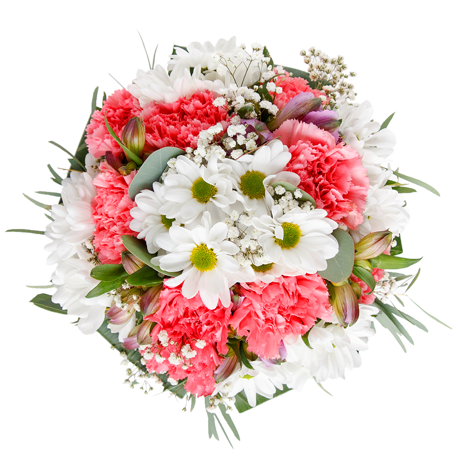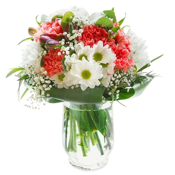 Express your sentiments with our beautiful seasonal bouquet, a perfect blend of snow-white chrysanthemums, delicate gypsophila, light pink carnations, and vibrant aspidistra leaves. This unique arrangement is designed to enchant and impress.